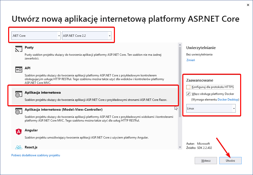6. W kolejnym oknie podajemy wersję .NET Core, w której będziemy tworzyć aplikację oraz ustawiamy 2 ważne parametry: