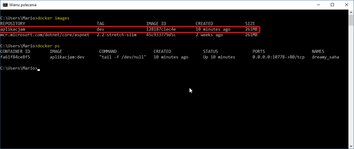 8. Zobaczmy jak nasza aplikacja wygląda od strony platformy Docker i kontenera. W wierszu poleceń Windows wydamy 2 komendy: “docker images” i “docker ps”.