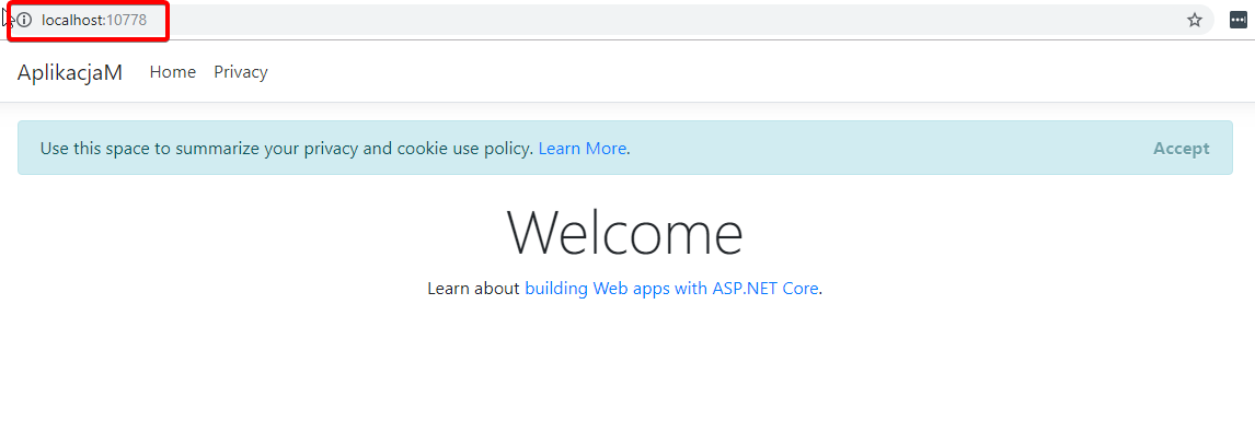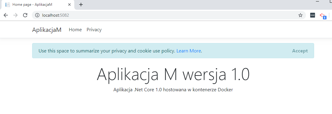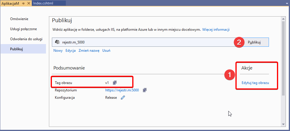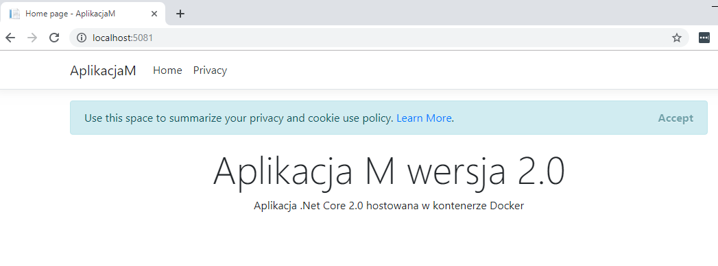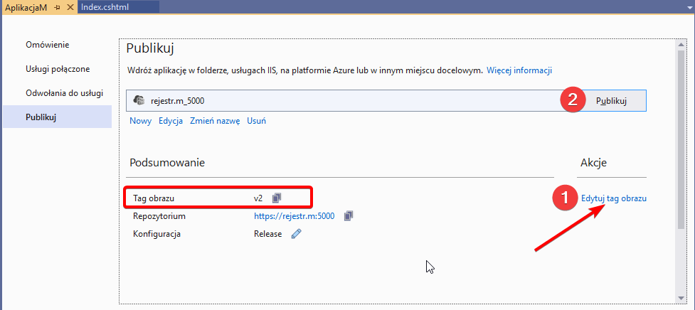 17. Zmodyfikuję w aplikacji plik Index.cshtml i zmienię nagłówek na “Aplikacja M wersja 2.0“. Następnie ponownie opublikuję aplikację w Docker, ale zmienię tag obrazu na v2.