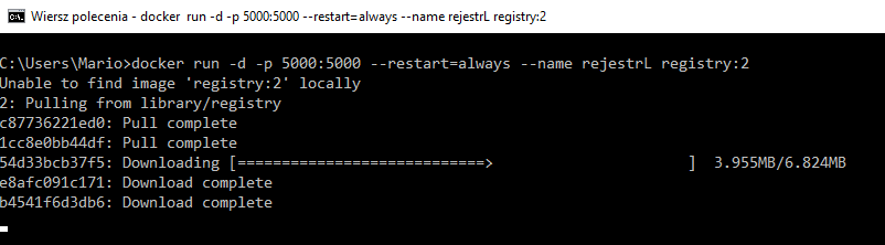 Docker nie posiada lokalnie obrazu aplikacji “registry” więc ściąga ją z publicznego rejestru. Pobiera tzw. warstwy czyli obrazy pośrednie konieczne do uruchomienia obrazu “registry”. Po ukończeniu pobierania obraz zostaje uruchomiony: