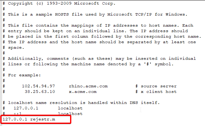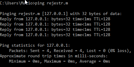10. W starszych wersjach Dockera można było używać url rejestru w postaci “localhost:5000” lub “127.0.0.1:5000”. W aktualnych wersjach przy próbie publikacji obrazu pod takim adresem rejestru pojawi się błąd. Konieczne jest podanie url w postaci nazwy rozwiązywalnej przez DNS. Aby zmienić url naszego hosta na akceptowalny przez Docker wykorzystamy plik znajdujący się w C:\Windows\System32\drivers\etc\hosts. Dla tych, którzy nie pamiętają co to za plik odsyłam do googla. W pliku dodajemy wpis i zapisujemy: