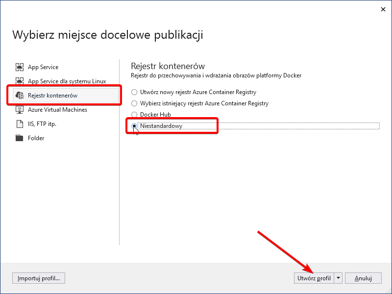 12. W kreatorze profili publikowania aplikacji wybieramy “Rejestr kontenerów” i po prawej opcję “Niestandartowy”. Klikamy “Utwórz profil”.