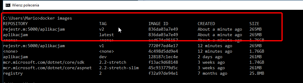 18. Po opublikowaniu aplikacji jest dostępny obraz z tagim v2. Zauważ że teraz kopia obrazu latest ma ID identyczne z obrazem v2, czyli ostatnim.