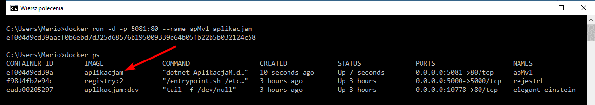 $ docker run -d -p 5081:80 –name apMv1 aplikacjam