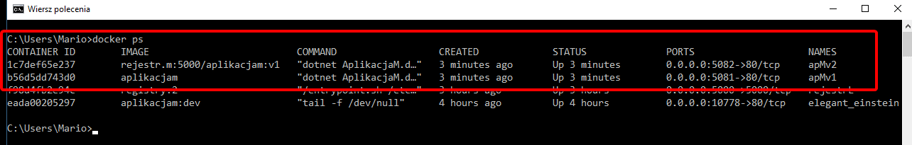 $ docker run -d -p 5082:80 –name apMv2 rejestr.m:5000/aplikacjam:v1