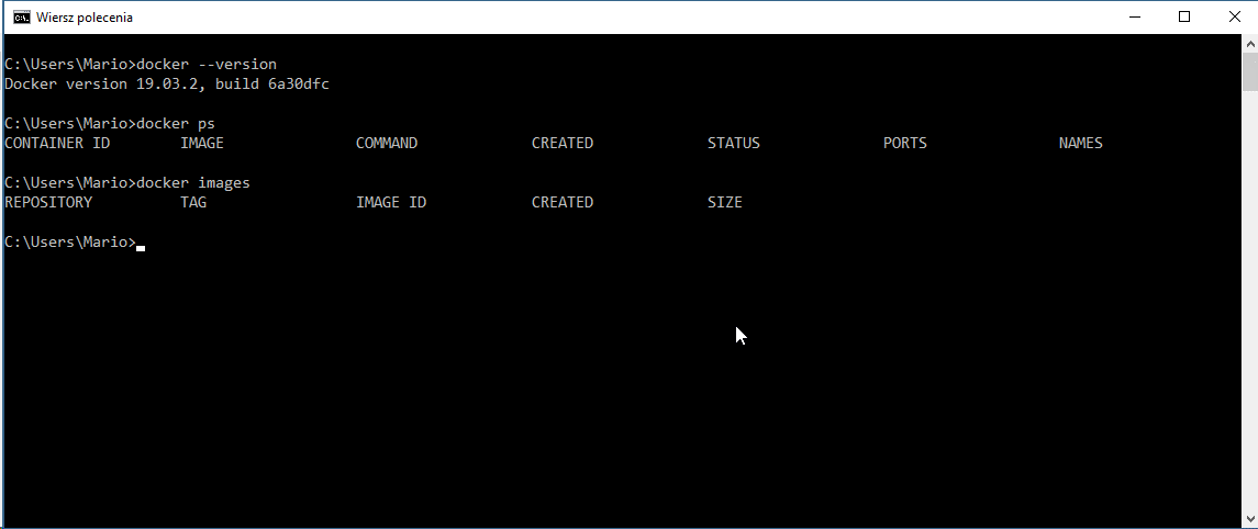 4. Możemy teraz wydać kilka poleceń “docker” w oknie wiersza poleceń Windows, aby sprawdzić czy docker działa.