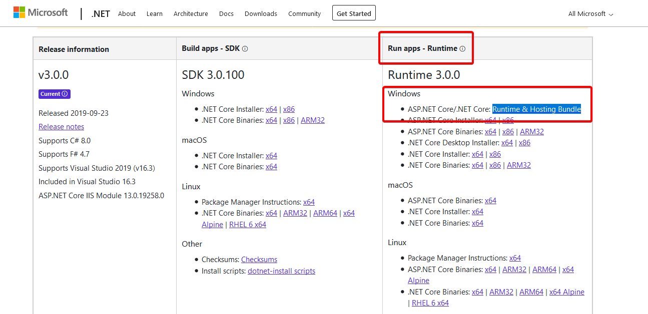 3. Na stronie, która się otworzy wybieramy pakiet “Runtime & Hosting Bundle”, pobieramy go i instalujemy na serwerze.