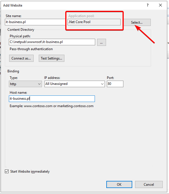 7. Podajemy parametry naszej strony pamiętając, żeby wybrać utworzoną wcześniej pulę “.Net Core Pool” tak jak pokazano to na poniższym rysunku.